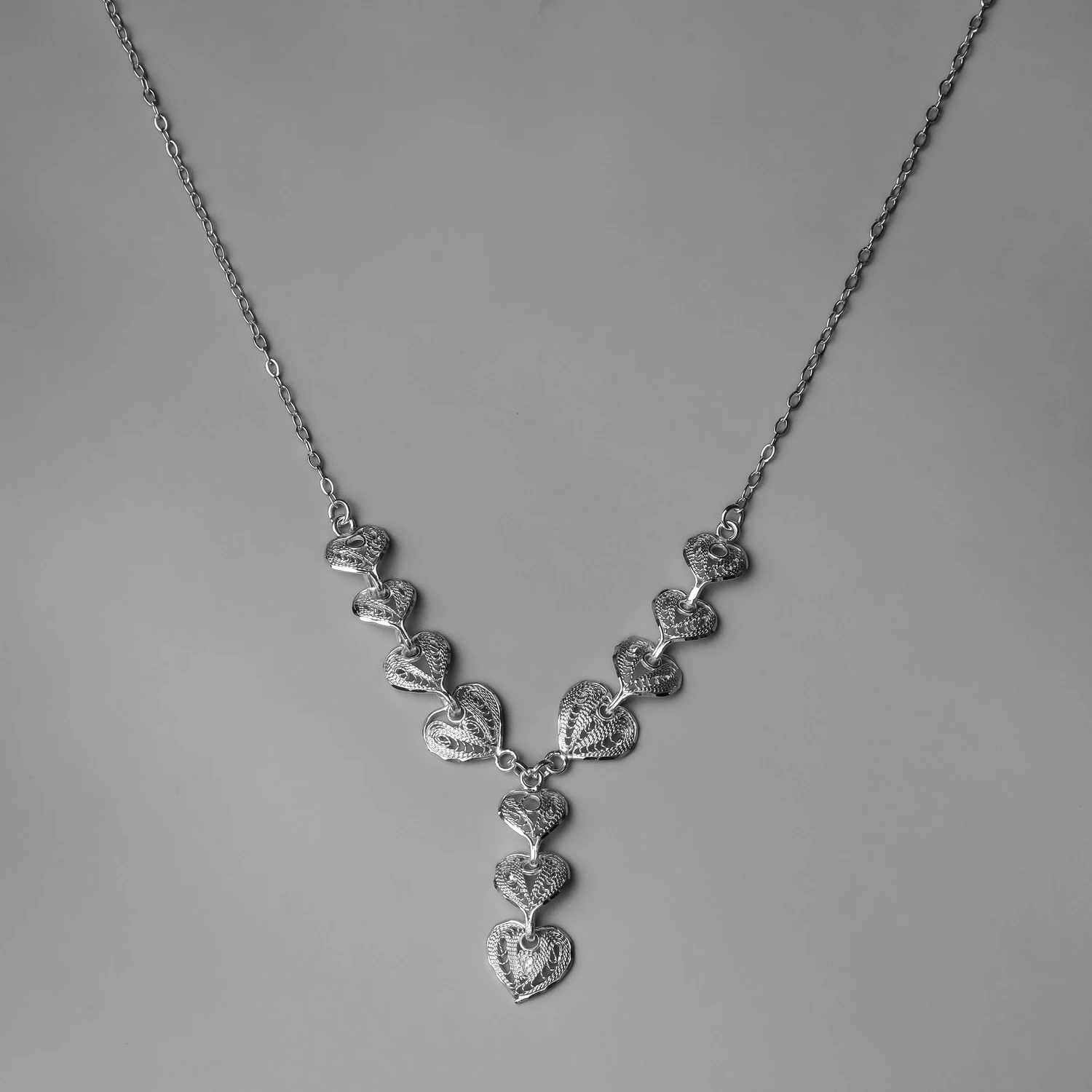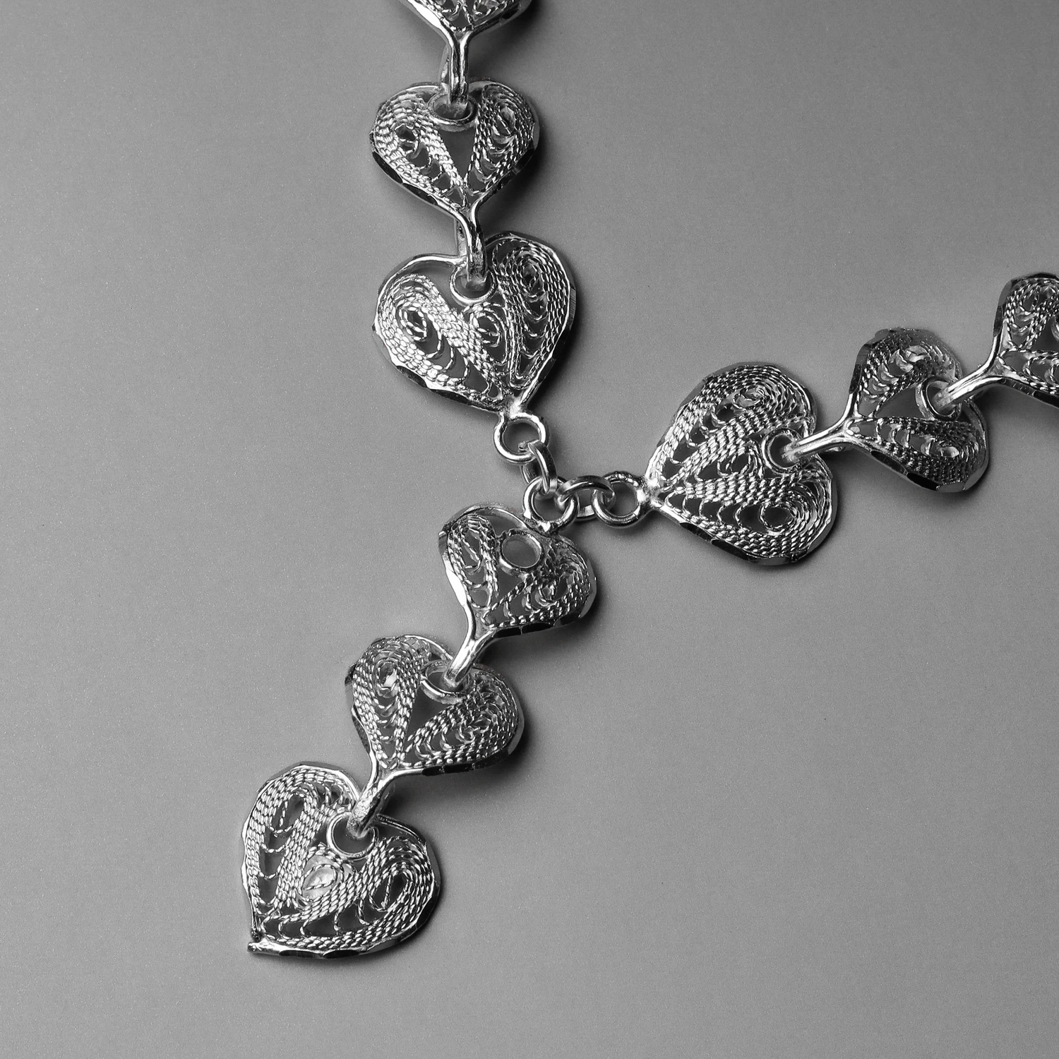 El amor no es un evento aislado, es un ritmo constante que nos mantiene vivos. El collar “Latidos” dibuja una cascada de corazones en plata, cada uno tejido con la paciencia de la filigrana, unidos para formar un flujo de luz sobre la piel. Esta pieza celebra la continuidad de los afectos: el amor propio, la conexión con otros y la fuerza suave que nos impulsa día a día. Una joya que no solo adorna, sino que recuerda que estar vivo es el acto más hermoso.