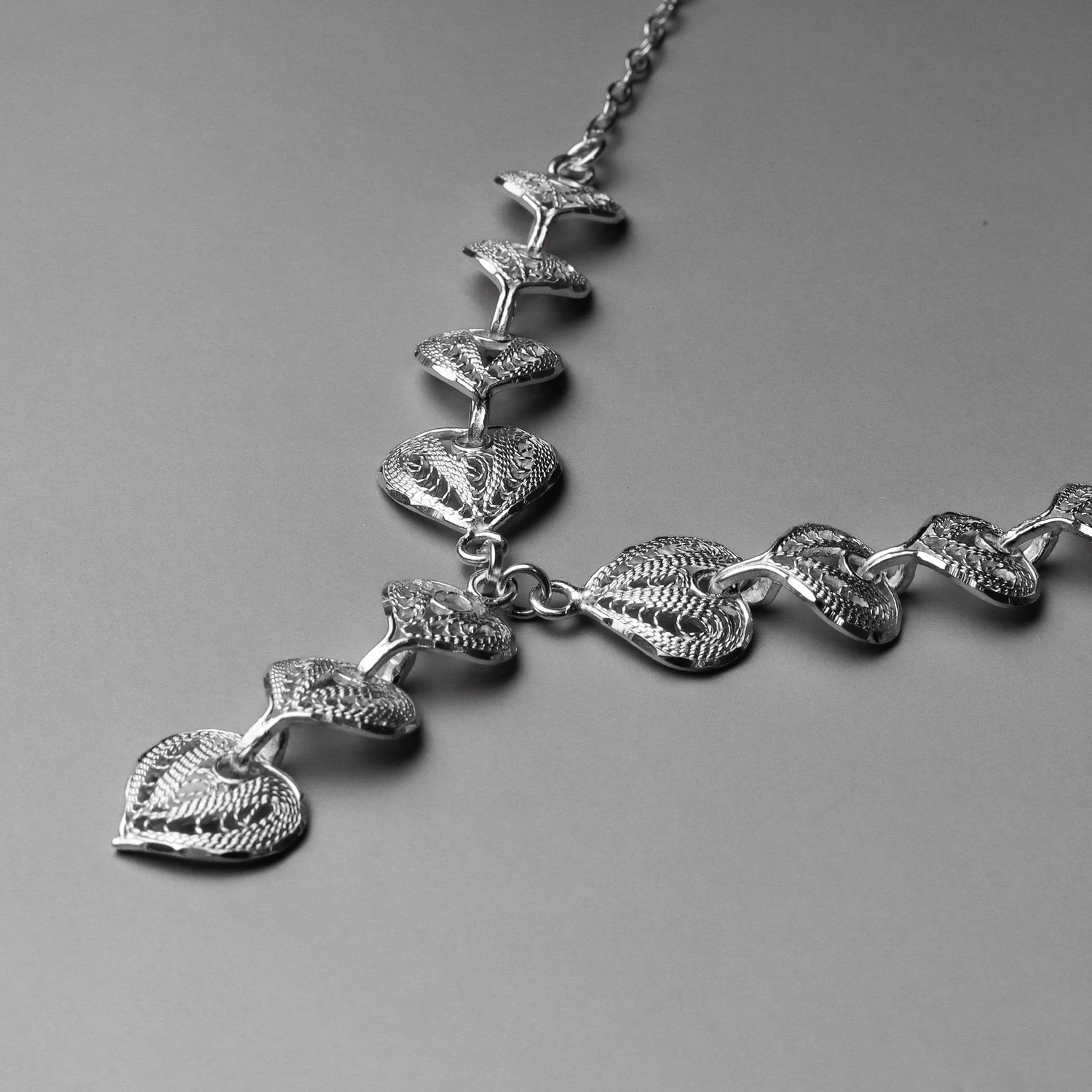 Diseño: Estructura tipo "Y" o corbatero, compuesta por una sucesión de corazones de filigrana articulados que crean movimiento y se adaptan a la silueta del cuello.